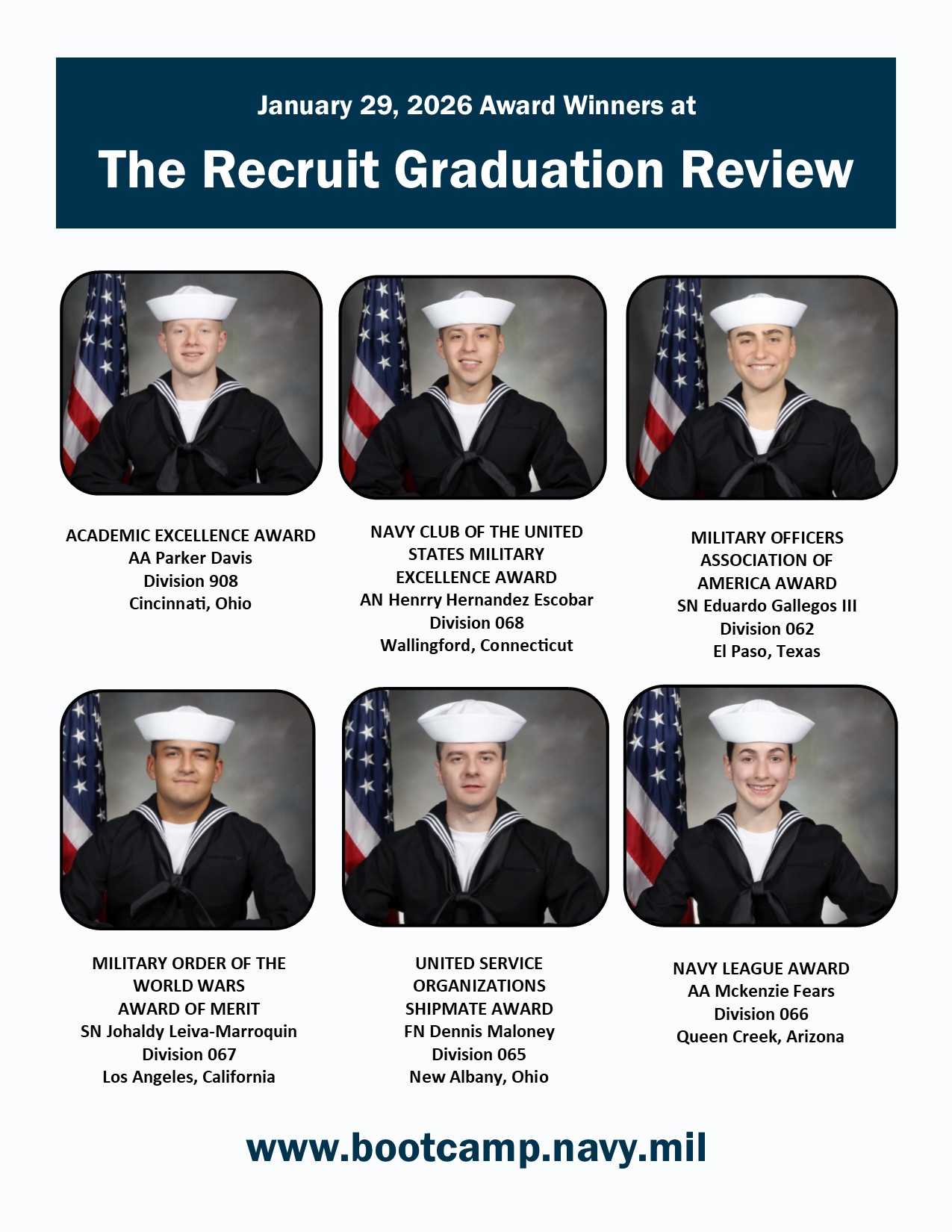 Each Award Winner will receive a letter of commendation from the commanding officer in recognition of their superlative achievements during recruit training.